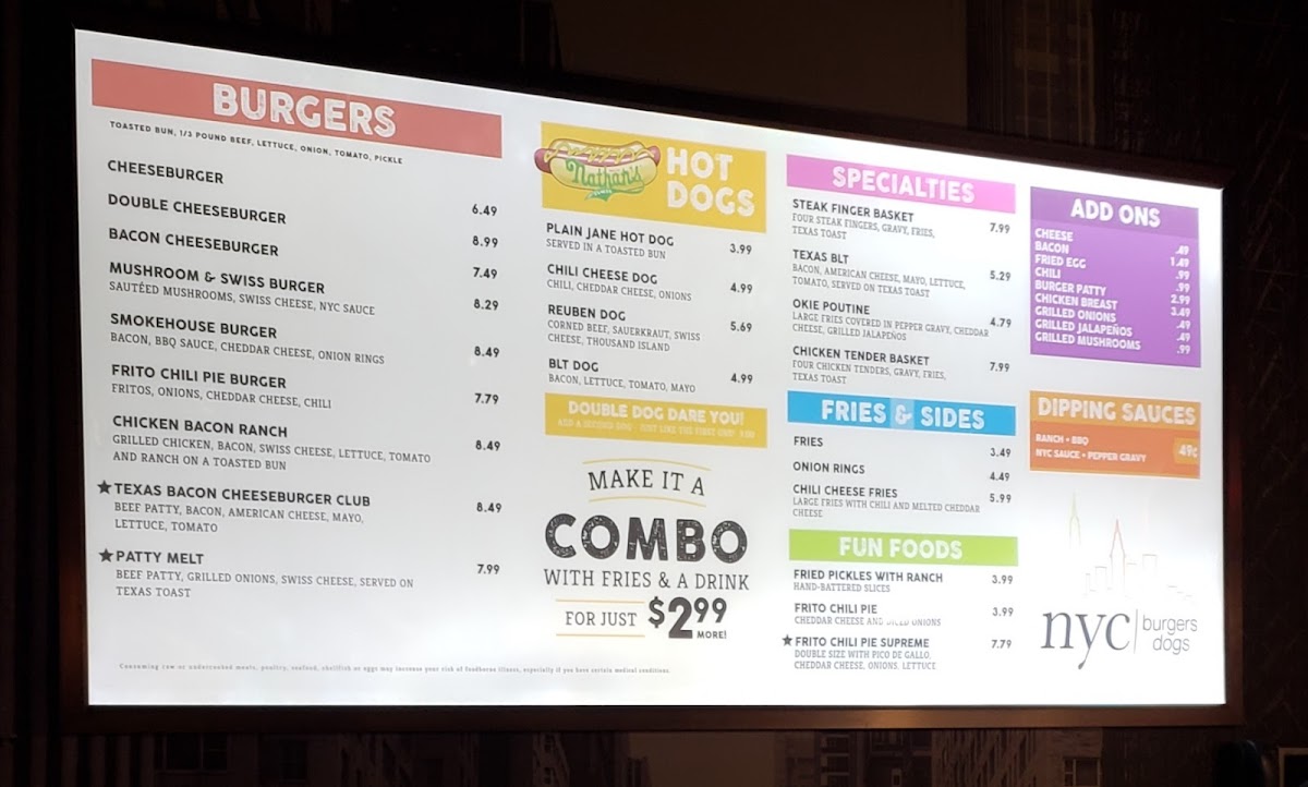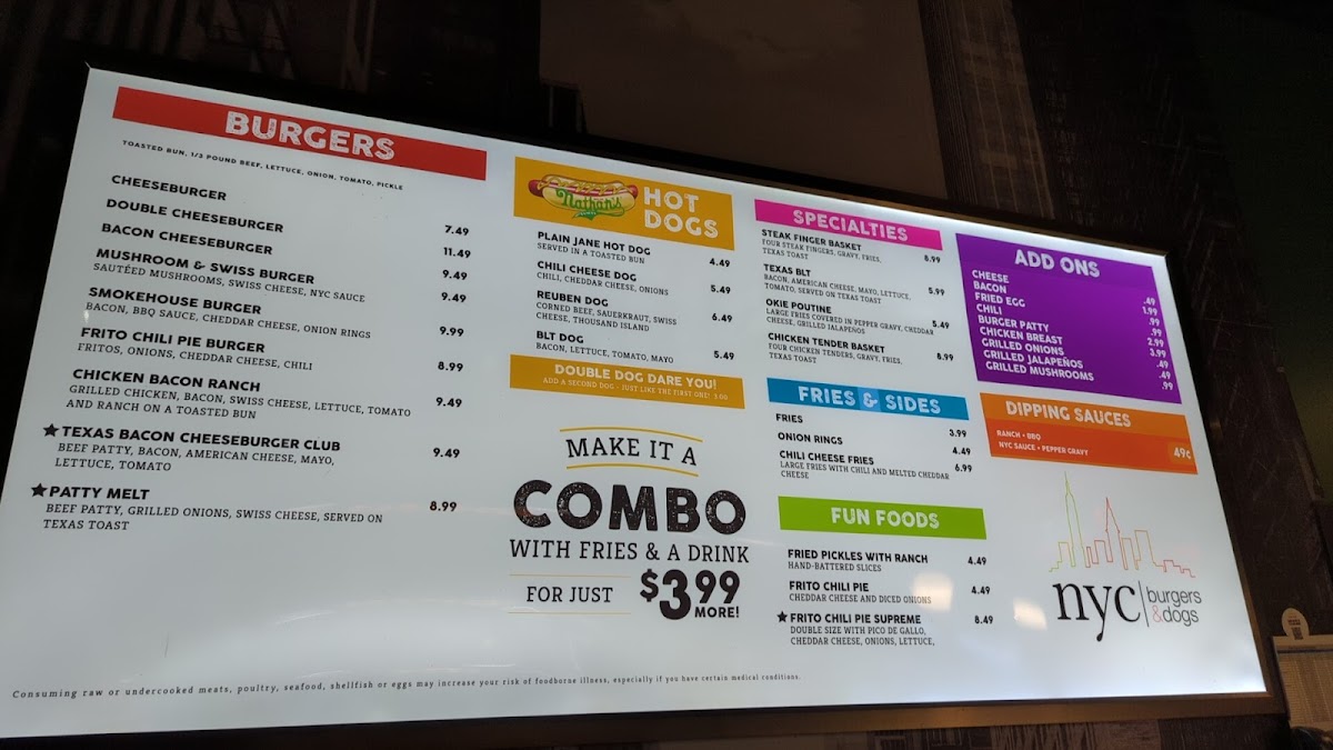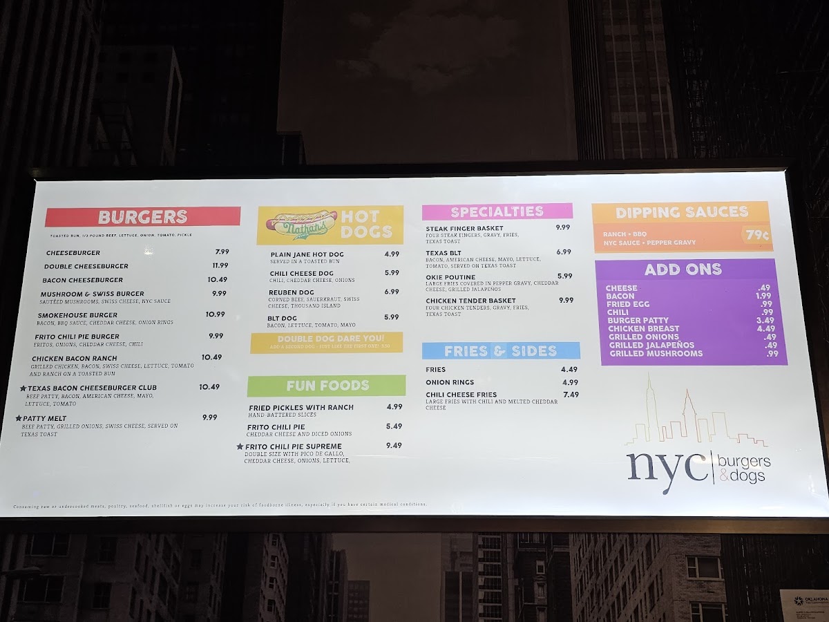 The menu at Nyc Burgers & Dogs in Thackerville offers a variety of hearty and flavorful options that cater to all tastes. For burger lovers, there's the classic Cheeseburger and indulgent Double Cheeseburger, or more unique choices like the Bacon Cheeseburger and Mushroom & Swiss Burger. The Smokehouse Burger adds a smoky twist to the mix. For those looking for fun and tasty sides, the Fried Pickles with Ranch and Frito Chili Pie are standout items, with the Frito Chili Pie Supreme being an elevated version. The specialties menu shines with dishes like the crispy Steak Finger Basket, the savory Texas BLT, and the indulgent Okie Poutine, alongside the classic Chicken Tender Basket. A selection of Fries and Onion Rings make great side options, with the loaded Chili Cheese Fries for something heartier. Hot dog enthusiasts can enjoy the Plain Jane Hot Dog or try something more inventive like the Chili Cheese Dog or Reuben Dog. For an extra treat, the BLT Dog brings together the best of both worlds. The option to Make it a Combo is available for many dishes, and with plenty of Add Ons like Cheese, Bacon, Fried Egg, Chili, and even an extra Burger Patty, customization is easy. The menu also offers a variety of dipping sauces including Ranch, BBQ, NYC Sauce, and Pepper Gravy to complement every bite. Overall, this menu is full of bold flavors and hearty options that are sure to satisfy any craving.